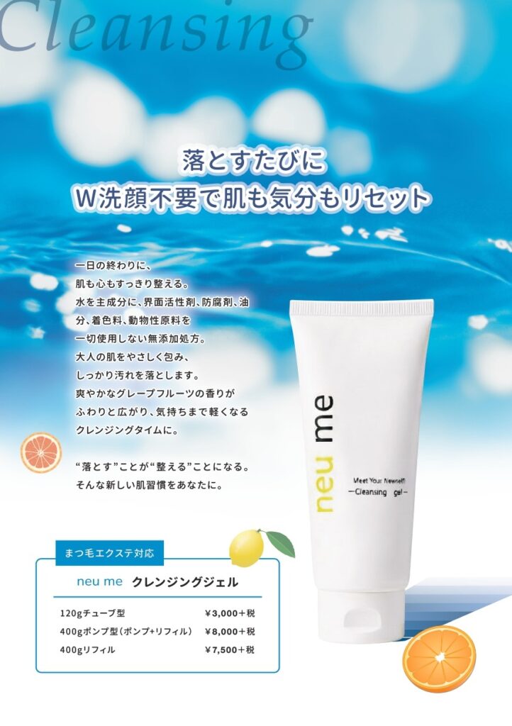 neu meのクレンジングジェルはW洗顔不要。水を主成分にした優しい処方で、メイク・皮脂・汚れをしっかりオフ。